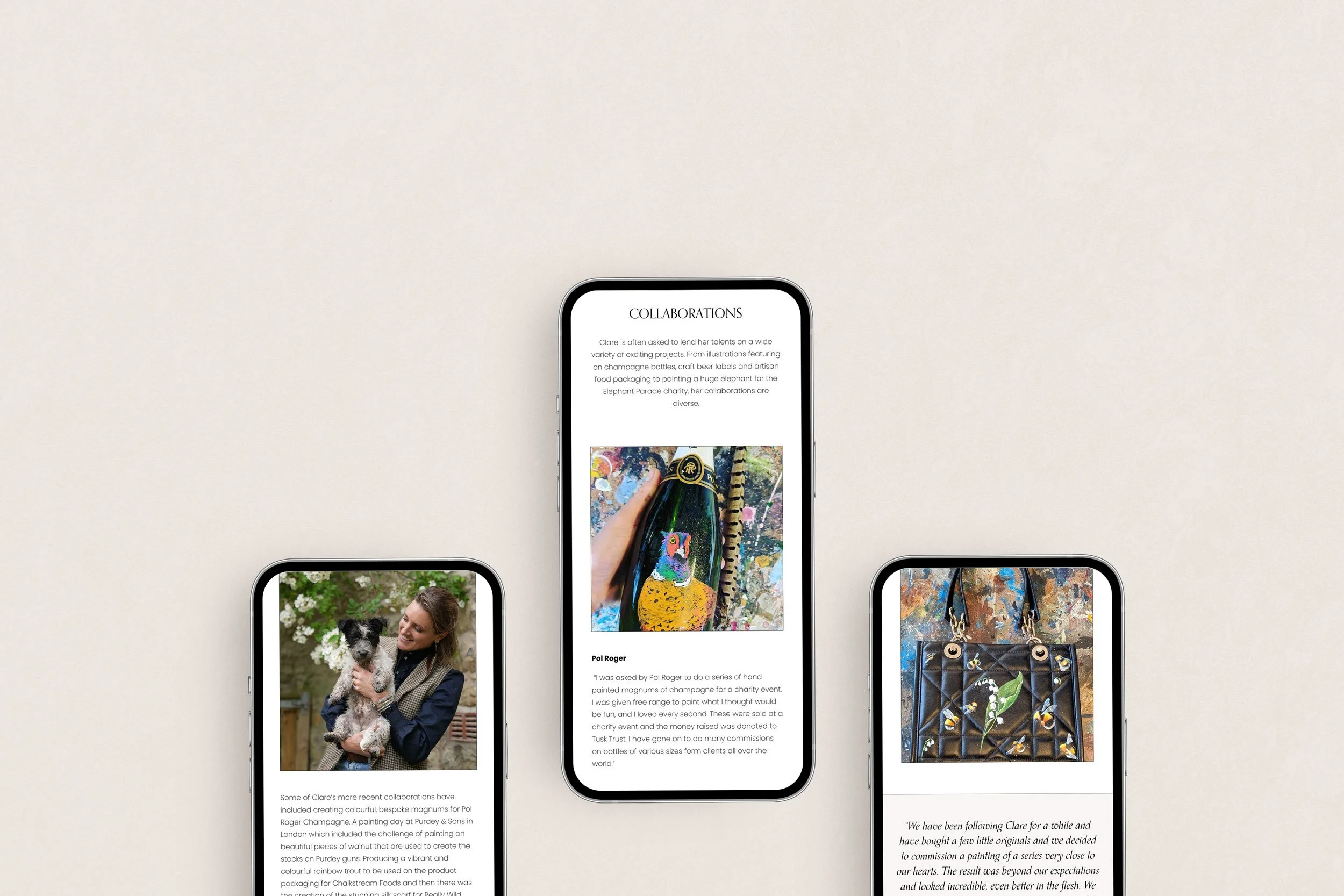 We began with the visual identity, which had started to feel dated and no longer reflected the quality of Clare’s artwork. We focused first on the logo, keeping her hand-drawn signature while redesigning the full logo suite. From there, we refined the font system. Clare was already using a clean, minimal sans serif for body copy, so I introduced an elegant, modern serif to bring a more refined and premium feel to headings.