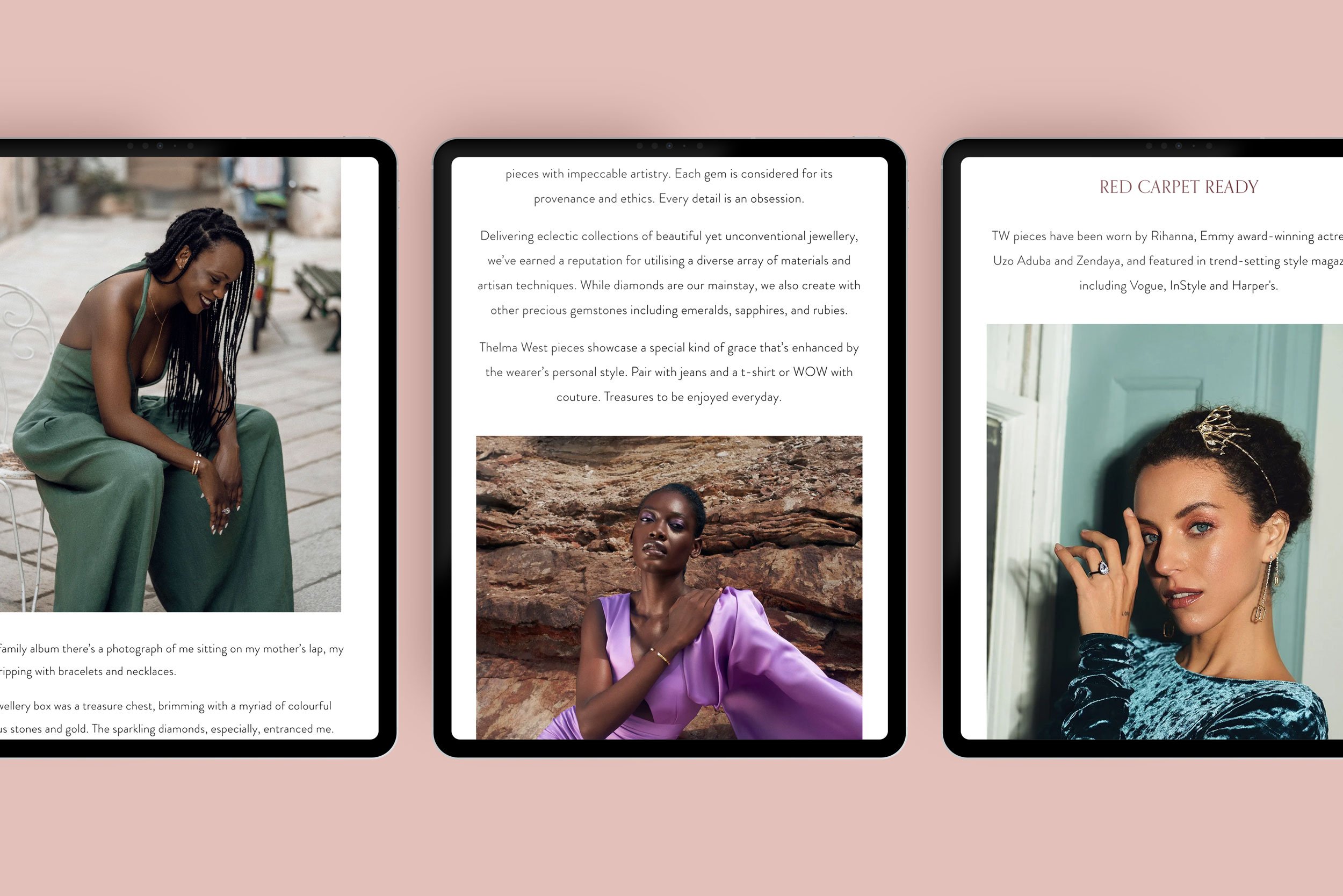 I’ve worked with Thelma for a few years now – initially styling her site and making sure everything looks impeccable and functions perfectly, and later on designing new sections and pages and redesigning the old ones. Adding new pieces as they become available to the public, assisting with the selection of the overall photography, designing behind-the-scenes graphics, and updating code, layouts, and overall look and functionality as needed were all a part of this project.